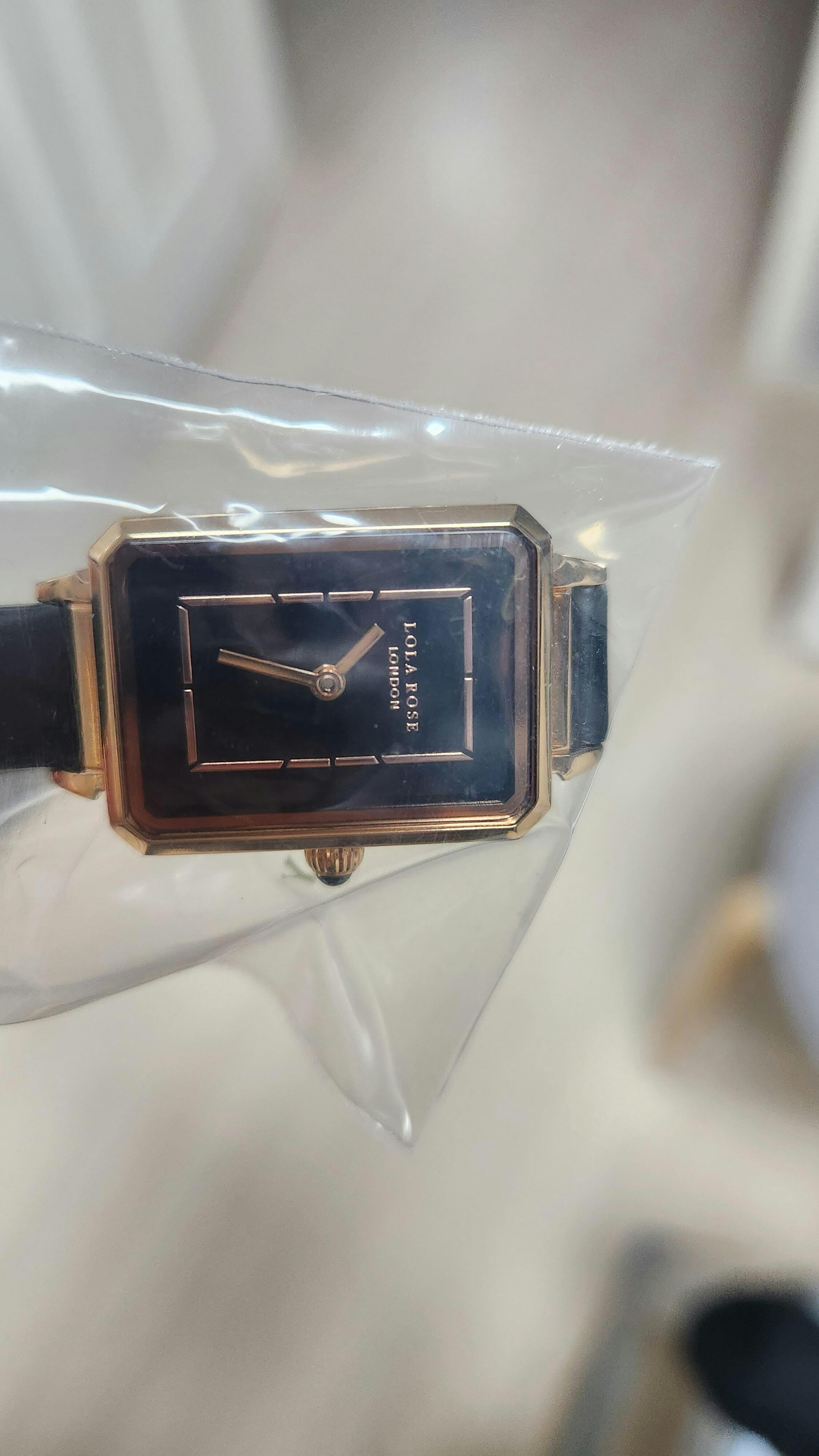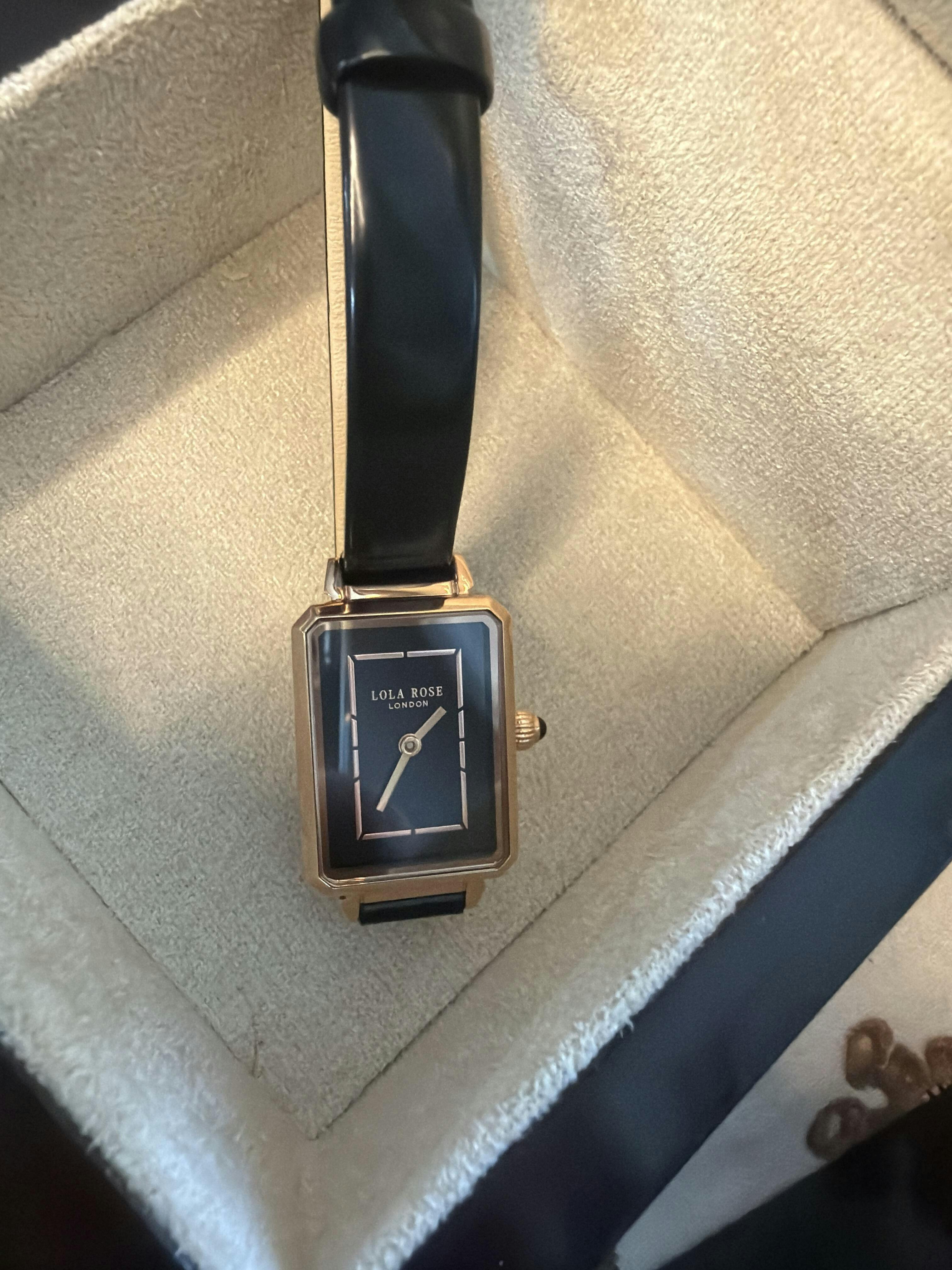 세련된 오닉스 블랙 다이얼과 블랙 레더 스트랩은 로즈골드 케이스를 더욱 돋보이게 하며 직사각형 인덱스는