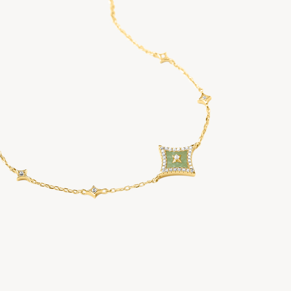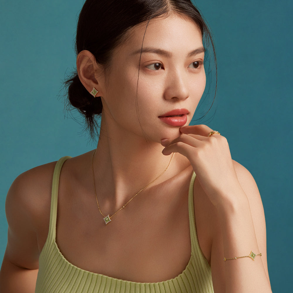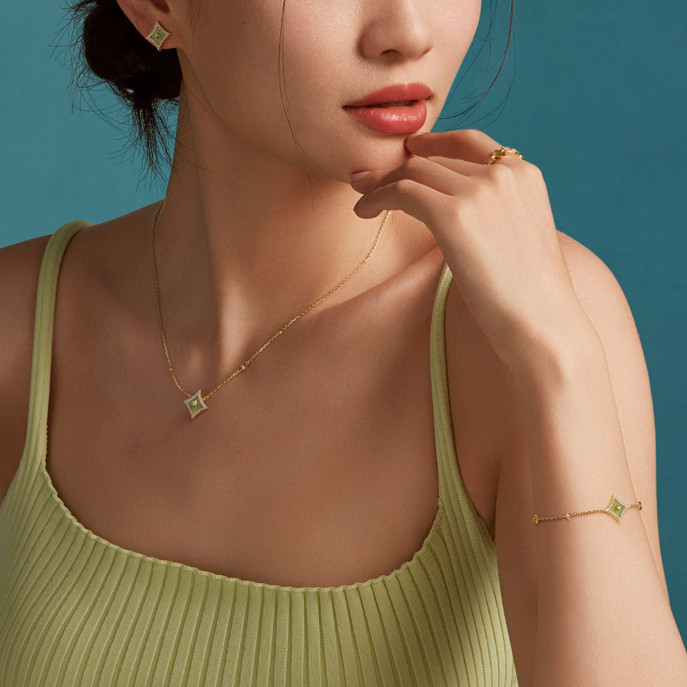 우아한 곡선의 시저 아치가 만나 이루는 사각 별 형태를 고스란히 담아낸 펜던트, 깊고 푸른 밤 하늘을 닮은 블루 샌드스톤과 정교하게 세팅된 지르코니아 큐빅이 눈부시게 반짝이는 별빛을 완성합니다.